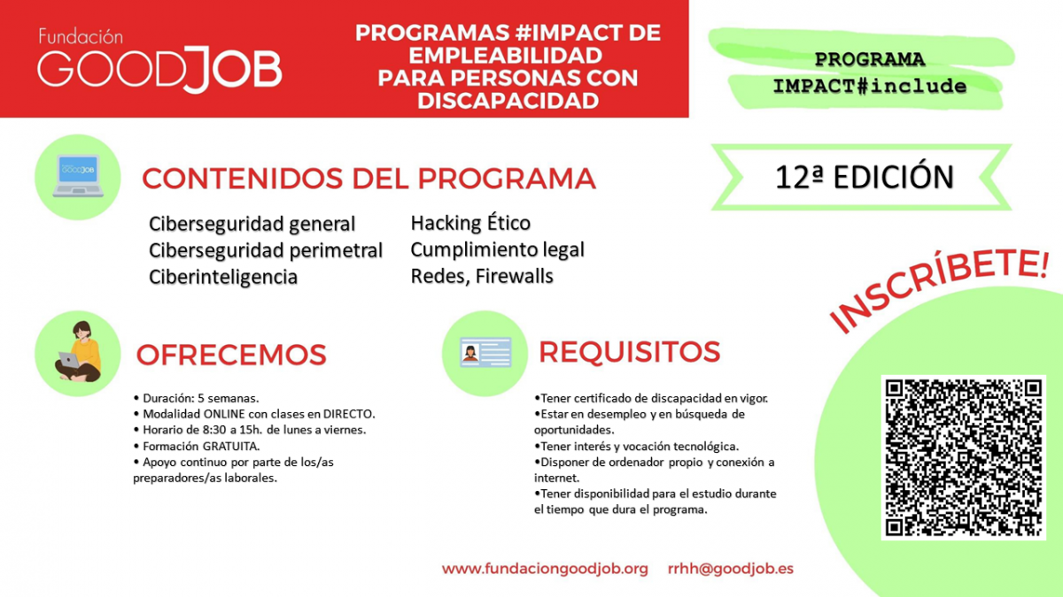 Desde Fundación Goodjob queremos informaros de que el próximo 27 de octubre de 2025 dará comienzo la 12ª edición del programa IMPACT #include – CIBERSEGURIDAD, una formación especializada que prepara a los participantes para desempeñarse en entornos reales de seguridad informática.