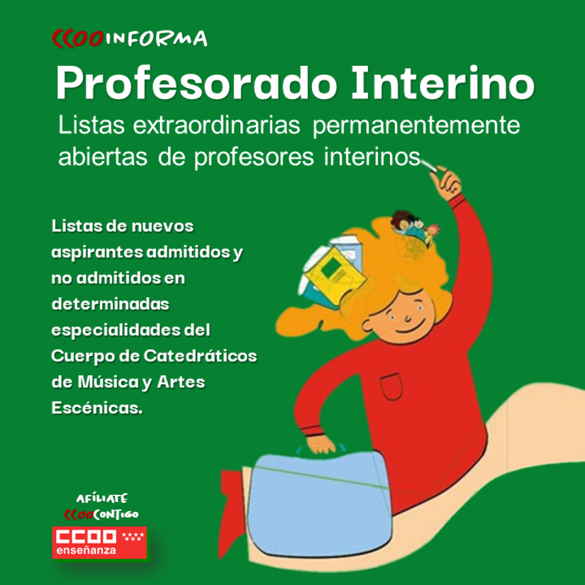 Listas extraordinarias de interinos permanentemente abiertas en especialidades del Cuerpo de Catedráticos de Música y Artes Escénicas. Listas de nuevos aspirantes admitidos y no admitidos en determinadas especialidades.