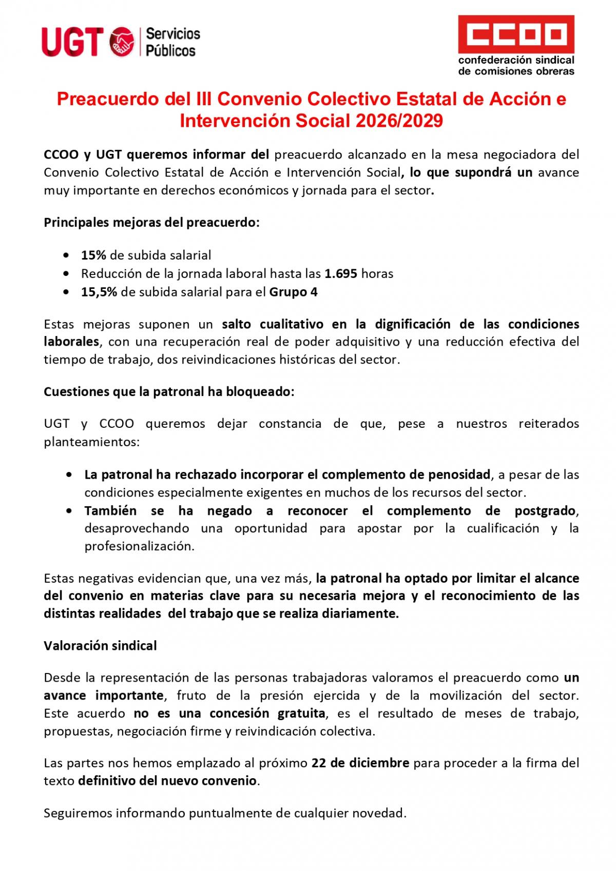 Las partes nos hemos emplazado al próximo 22 de diciembre para proceder a la firma del texto definitivo del nuevo convenio.