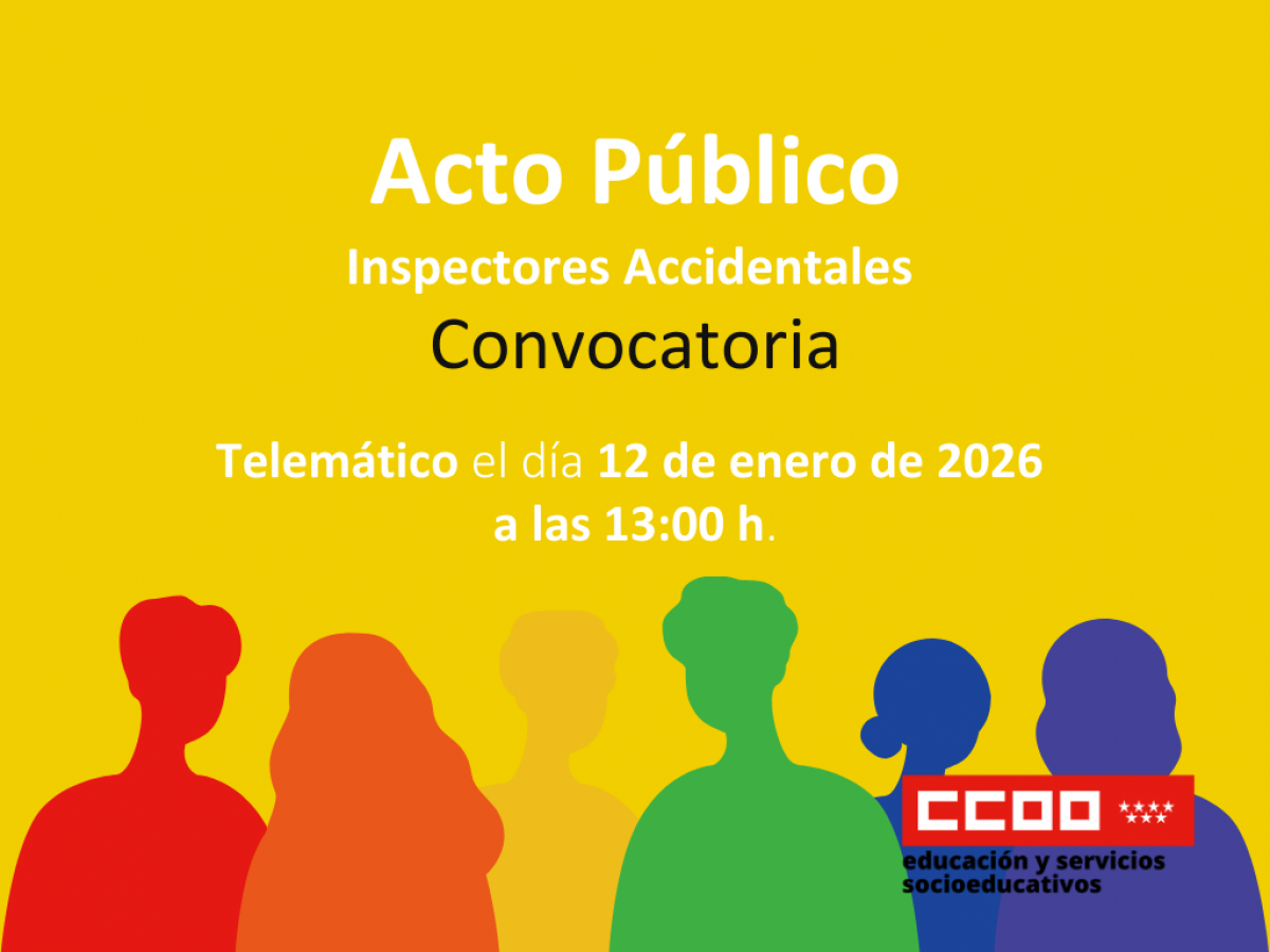 Se convoca acto público para desempeñar puestos de inspector de educación accidental en el Servicio de Inspección Educativa de Madrid-Capital y Madrid-Oeste. El acto será telemático y tendrá lugar el día 12 de enero de 2026 a las 13:00 h.