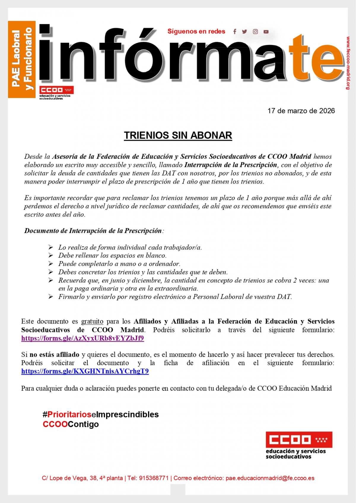 Desde la Asesoría de la Federación de Educación y Servicios Socioeducativos de CCOO Madrid hemos elaborado un escrito muy accesible y sencillo, llamado Interrupción de la Prescripción, con el objetivo de solicitar la deuda de cantidades que tienen las DAT con nosotros, por los trienios no abonados, y de esta manera poder interrumpir el plazo de prescripción de 1 año que tienen los trienios.