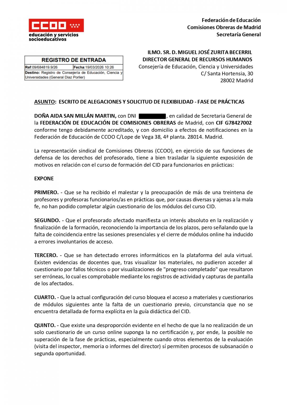 La Federación de Educación de CCOO Madrid ha denunciado la situación de indefensión en la que se encuentran decenas de profesores y profesoras funcionarios en prácticas debido a la rigidez y los fallos técnicos de la plataforma de formación del Centro de Innovación y Formación (CID).