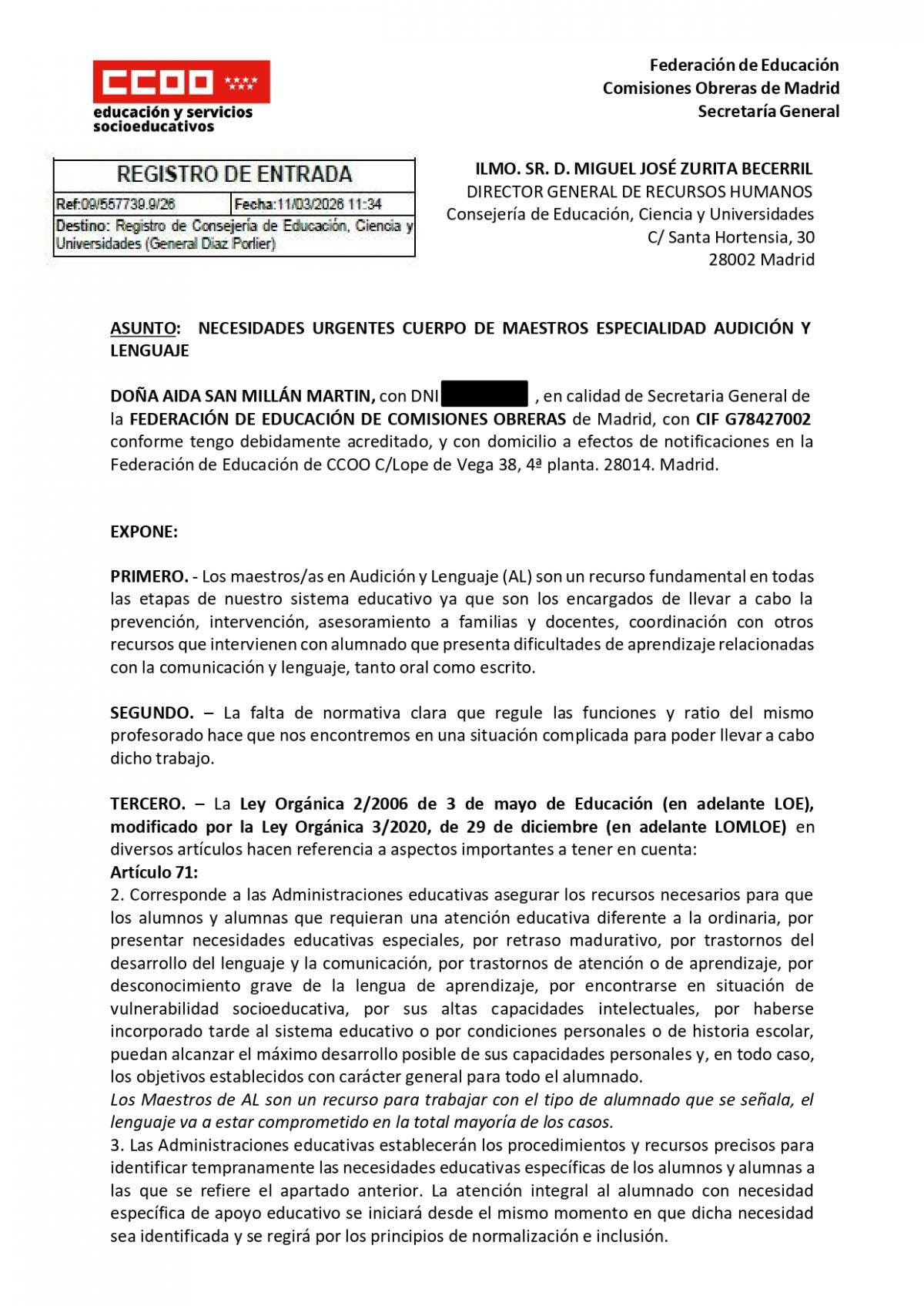 CCOO recuerda que la LOMLOE (Art. 71 y 73) obliga a las Administraciones a dotar de los recursos necesarios para la detección temprana y atención integral del alumnado con necesidades específicas de apoyo educativo. Sin embargo, en la Comunidad de Madrid, el Decreto 23/2023 deja la atención de alumnos con retraso madurativo, TDAH o dislexia sometida a la "disponibilidad" de los maestros de AL, siempre que sus grupos no estén ya saturados.
