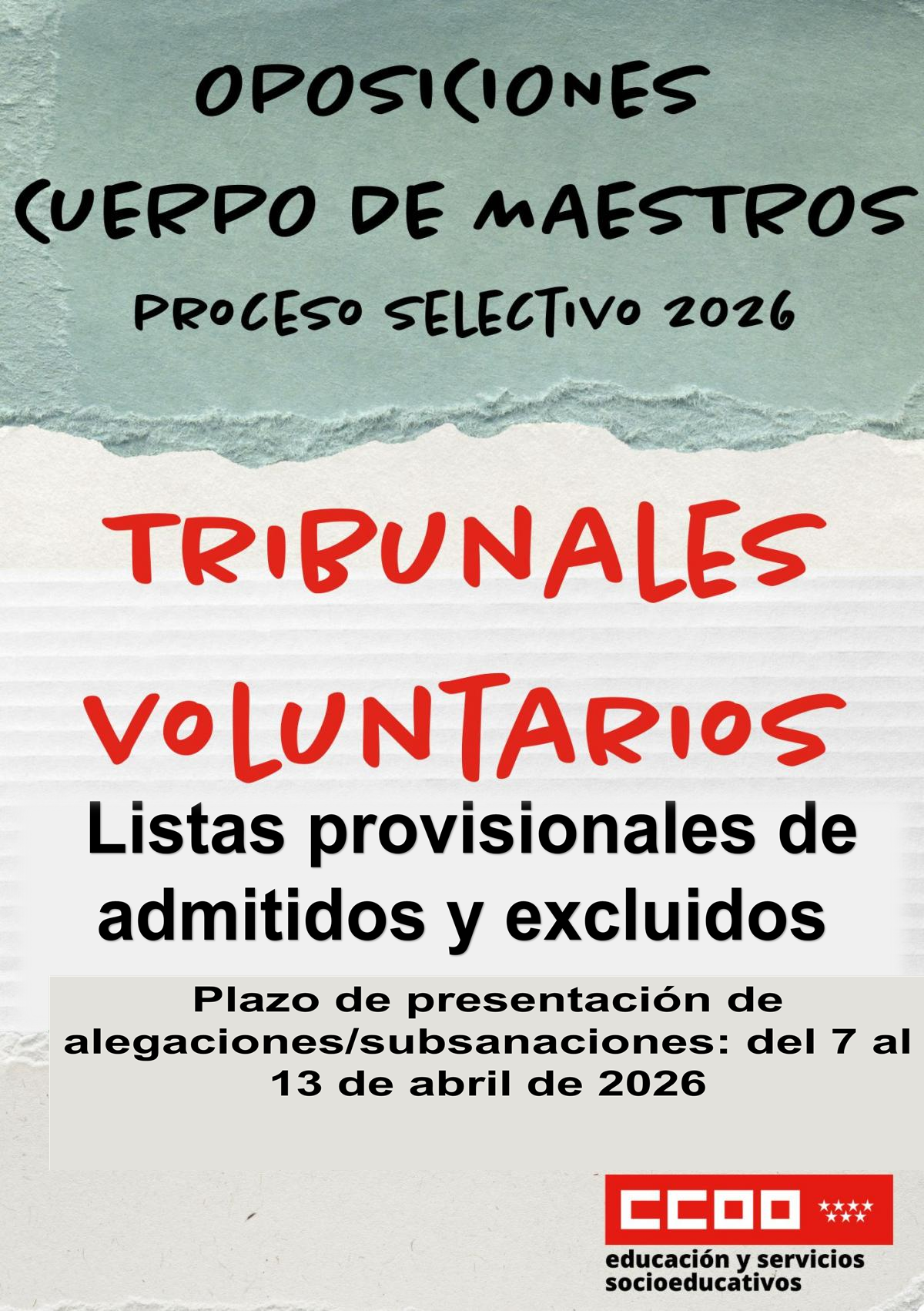 Se aprueban las listas provisionales de admitidos y excluidos para la participación, con carácter voluntario, como miembros de los tribunales en los procedimientos selectivos para ingreso en el Cuerpo de Maestros y para adquisición de nuevas especialidades en el citado cuerpo, que se desarrollen durante el año 2026. (Resolución de 27 de marzo de 2026, de la Dirección General de Recursos Humanos, publicada el 6 de abril de 2026. Enlace al trámite)
