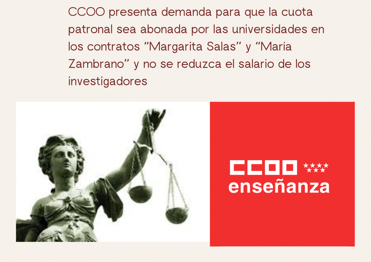 CCOO presenta demanda para que la cuota patronal sea abonada por las universidades en los contratos “Margarita Salas” y “María Zambrano” y no se reduzca el salario de los investigadores